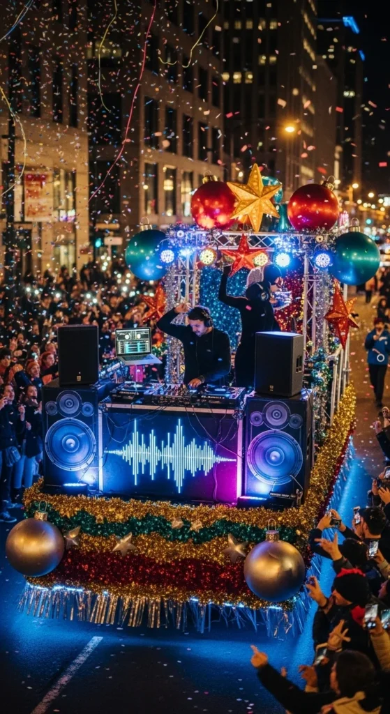 Bring compact equipment, use battery power, and test audio levels before moving. Wear festive clothing and include remixed carols for an upbeat parade vibe.