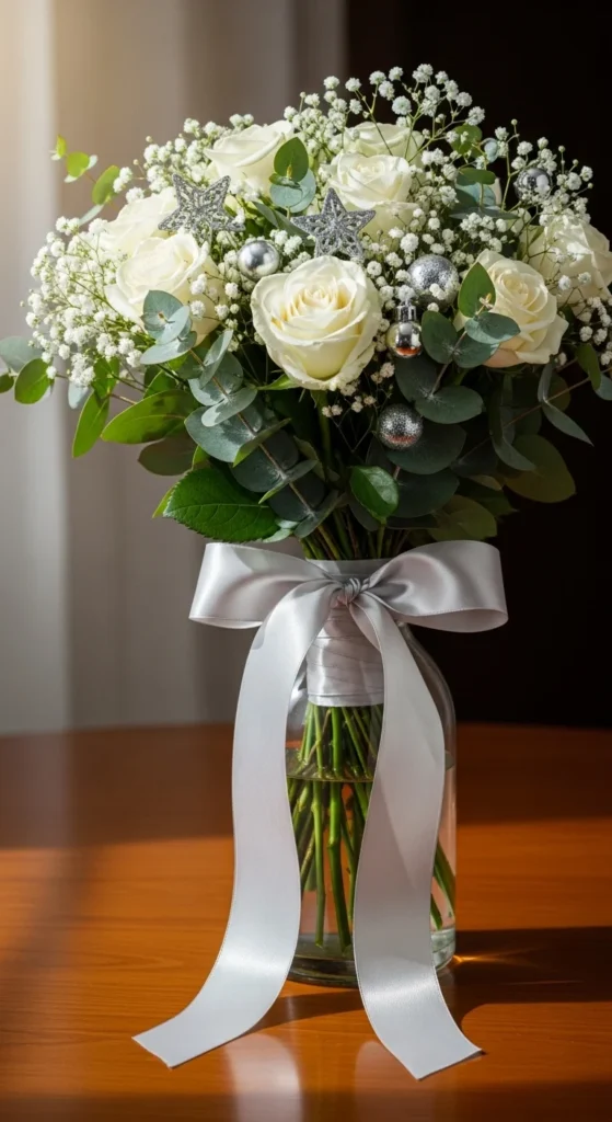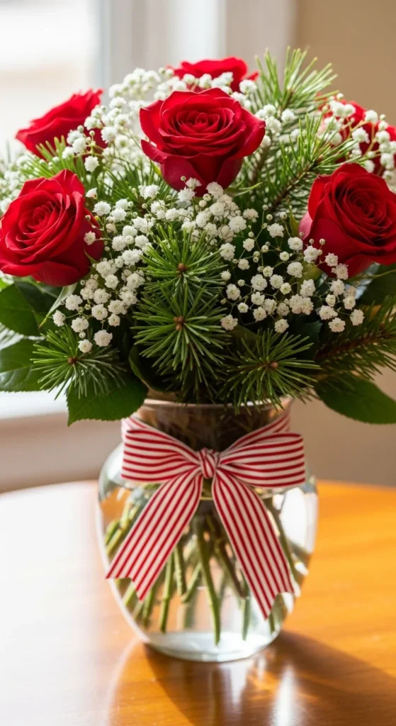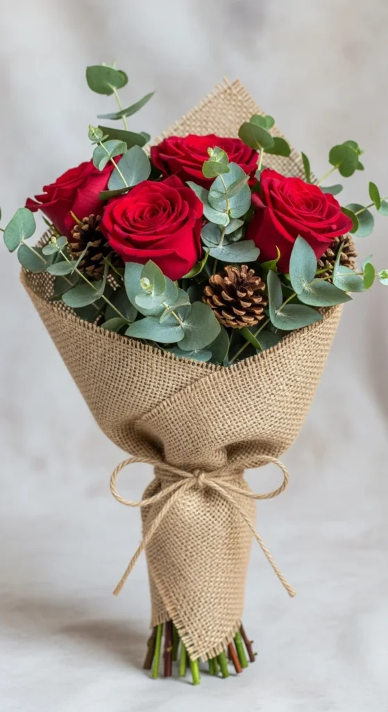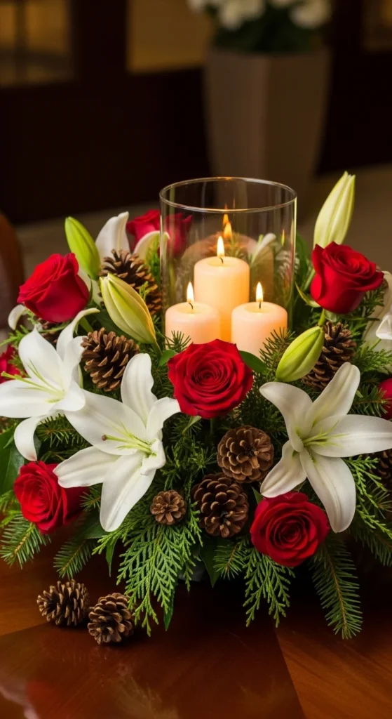 Use low vases for stability and mix roses with lilies or carnations. Add pinecones and silver accents for texture. Offer small, medium, and deluxe versions online — customers love size options for gifting. Keeping materials affordable makes your profit margin strong.