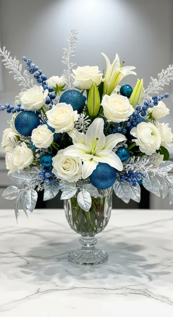 Blue and silver give a winter wonderland feel. Combine white lilies with frosted eucalyptus or silver-painted branches.