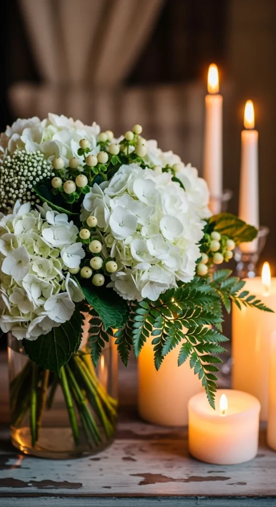 Hydrangeas bring a lush texture. Combine them with ferns and silver sprigs.