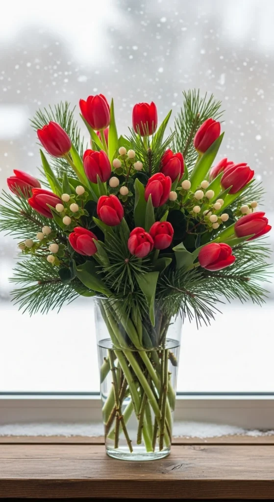 Pair with evergreens for texture and a strong fragrance. This arrangement stands out because tulips aren’t typical Christmas flowers, giving it a unique twist for online shoppers.
