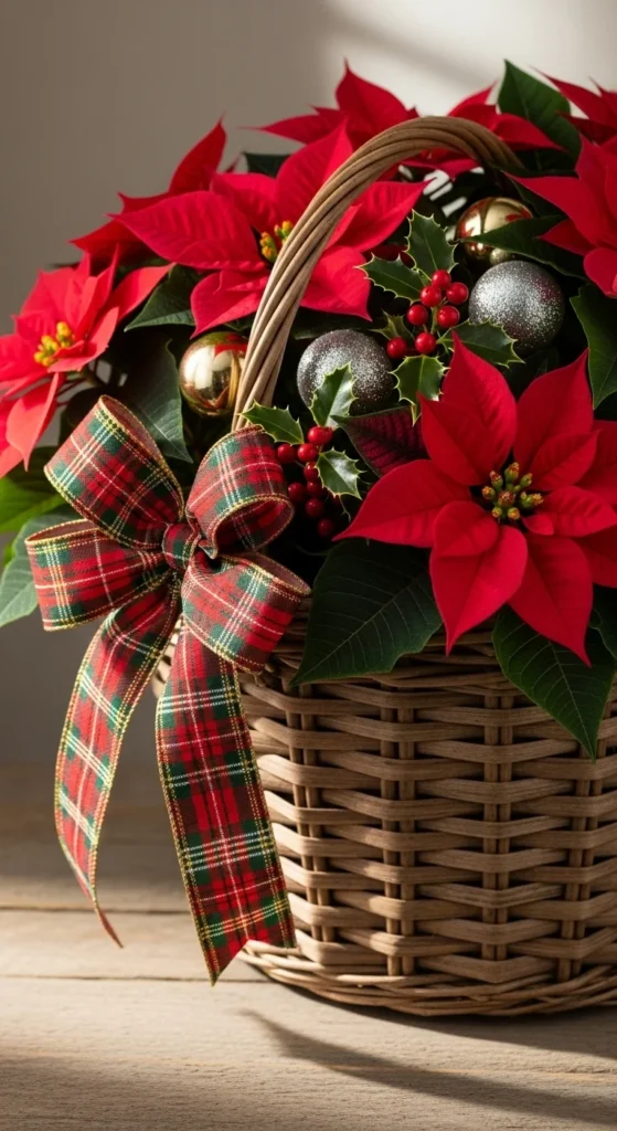 Poinsettias are the face of Christmas florals. Arrange them in natural wicker baskets for a rustic, cozy appeal.