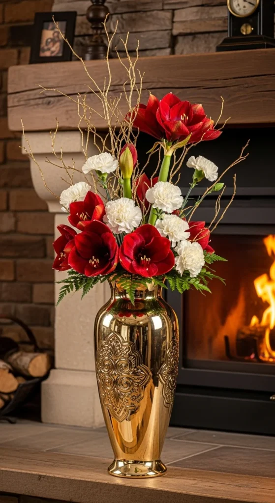 This timeless combination of red and white flowers with greenery never goes out of style. It suits dining tables, offices, and gift baskets.