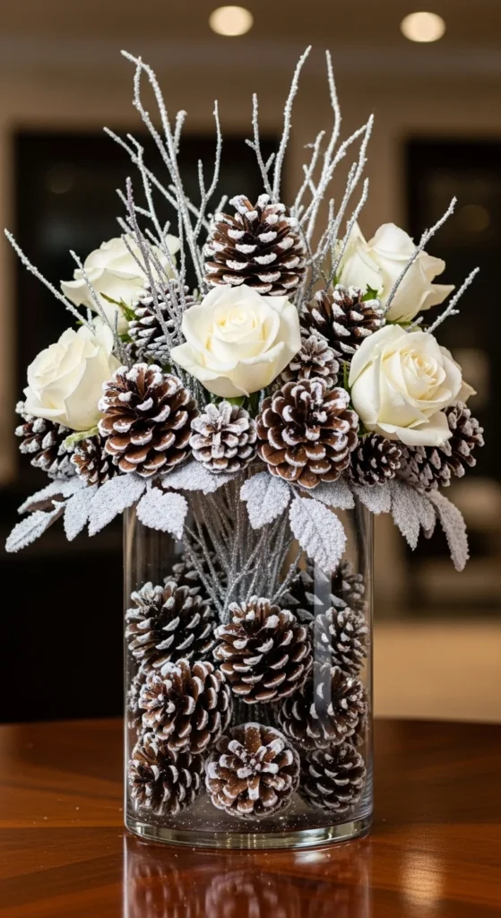 This arrangement feels wintry and modern. Use frosted artificial pinecones and light floral touches.
