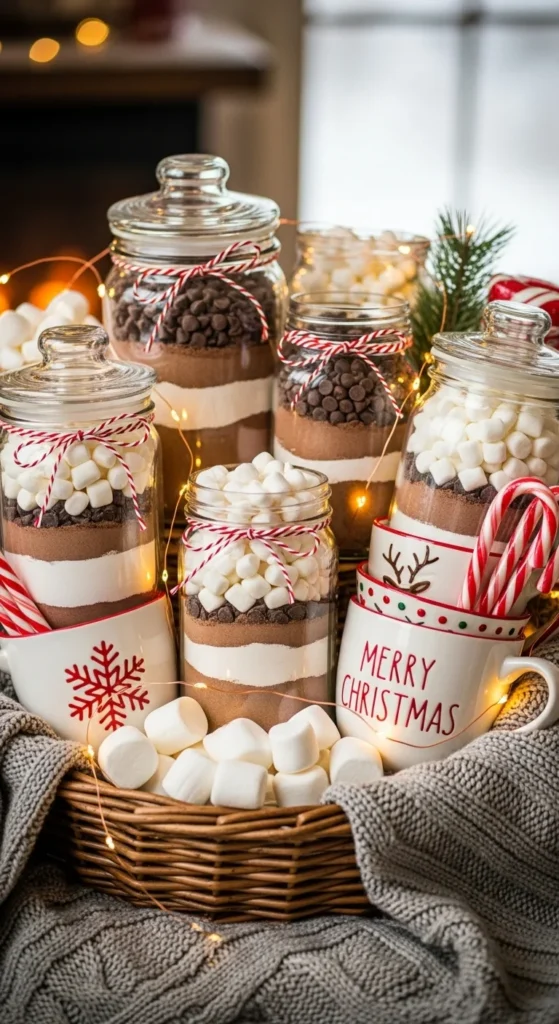 Fill a wicker basket with cocoa mix jars, mini marshmallows, and peppermint sticks.