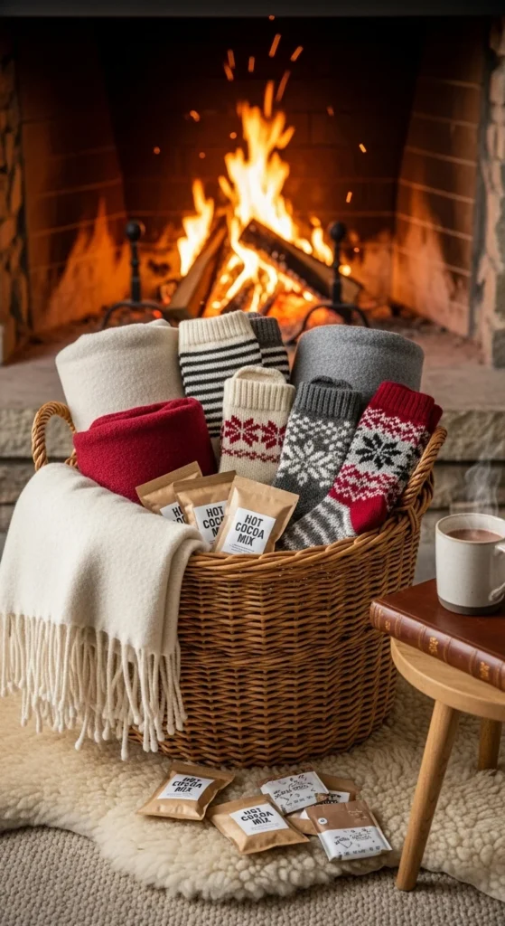 Add a fluffy throw blanket, fuzzy socks, and cocoa sachets.