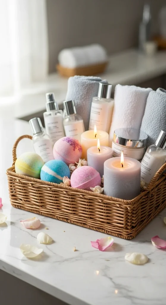 Combine body scrubs, bath salts, face masks, and a candle in one box.