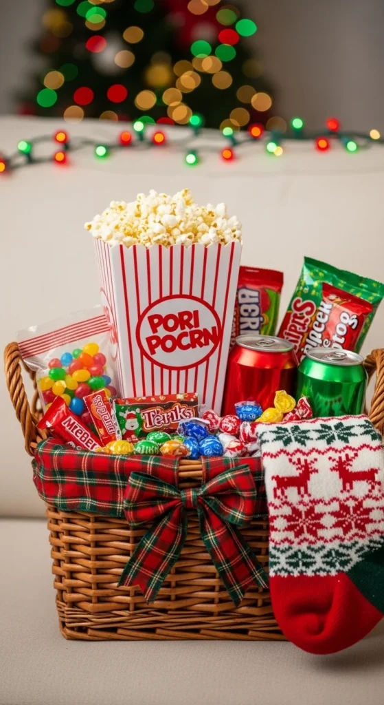Include microwave popcorn, chocolates, and soda or cocoa.