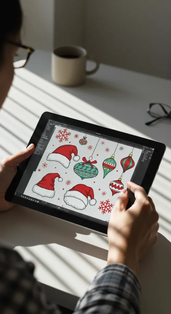 Coloring books aren’t just for kids. Create digital pages featuring Christmas trees, snowmen, and ornaments. Sell printable PDFs or upload the designs to Amazon KDP for printed versions. Parents and teachers buy these for kids’ activities, making them strong sellers every December.