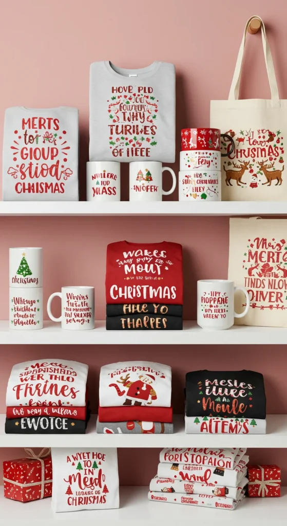 Print-on-demand services like Redbubble or Printify let you upload holiday designs that get printed on items like shirts or mugs. You don’t handle inventory or shipping—the platform does it all. Simple quotes like “Merry & Bright” or “Santa’s Favorite” can sell well. Promote your items on Pinterest for more exposure.