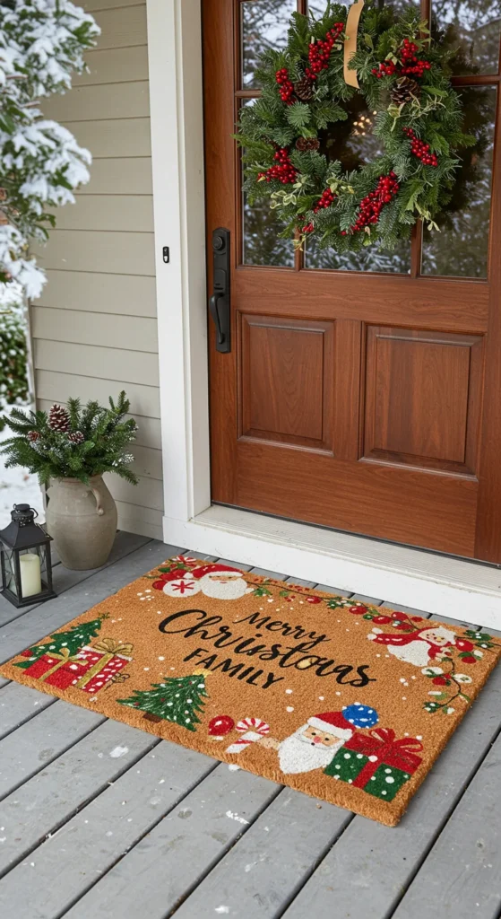 A cheerful doormat sets the tone for the season. Offer funny phrases, classic greetings, or personalized designs.