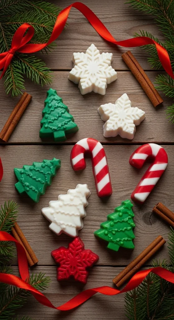 Create holly-shaped toppers using red and green soap embeds.