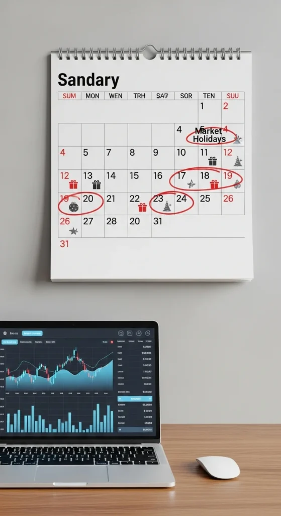 Stock markets close early on certain days around Christmas and remain closed on major holidays. Missing these can disrupt your trades.