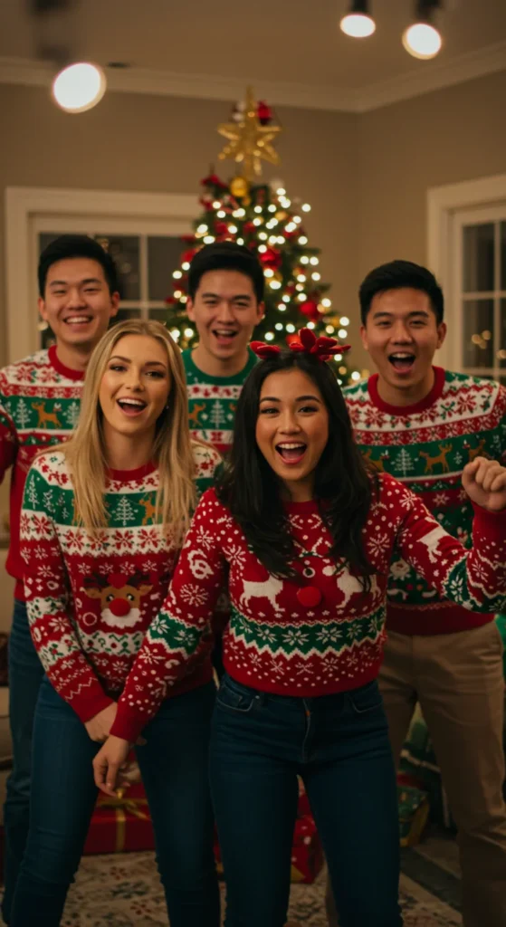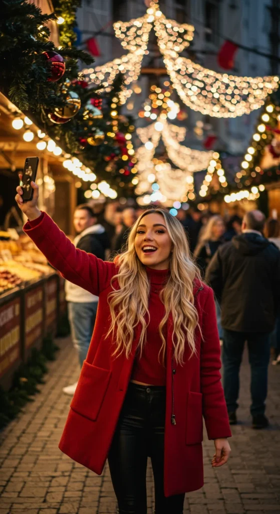 Outfit transition videos thrive on TikTok. Start in casual clothes, then transition with a jump, snap, or spin into a fully styled Christmas outfit.