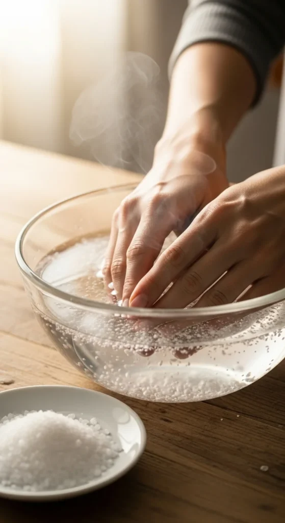 Warm salt water relaxes tired hands. Dissolve a small amount of salt in warm water. Soak hands for ten minutes.