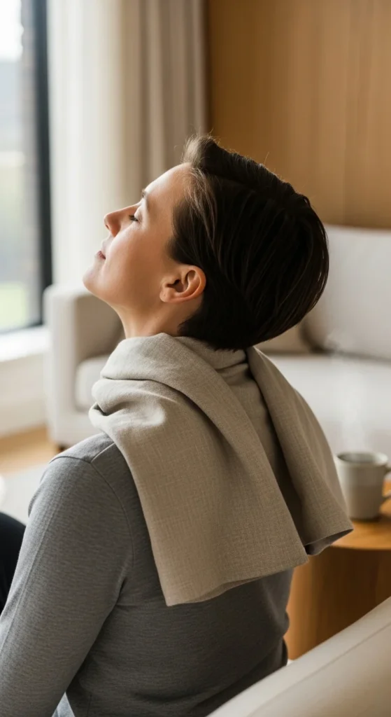 Soft stretching releases stored tension. Focus on slow movements. Neck rolls. Shoulder shrugs. Gentle twists.