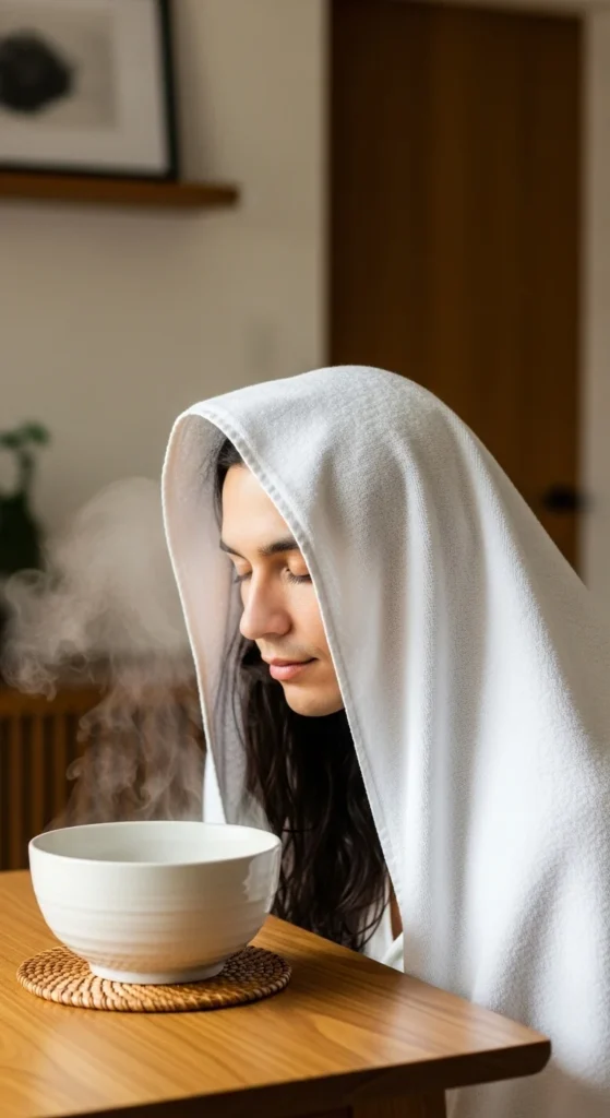 Warm steam helps relaxation. Use plain water or add herbs if available.