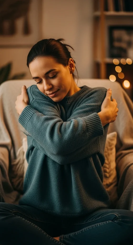 A self-hug offers comfort and safety. Cross arms over your chest. Rest hands on opposite shoulders. Apply gentle pressure.