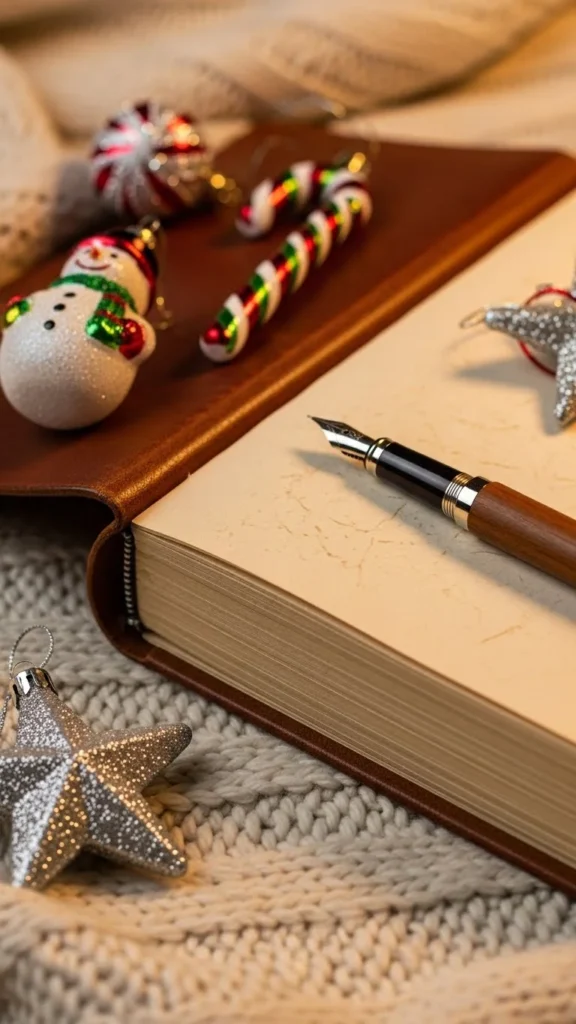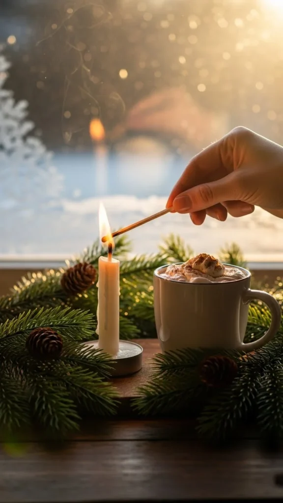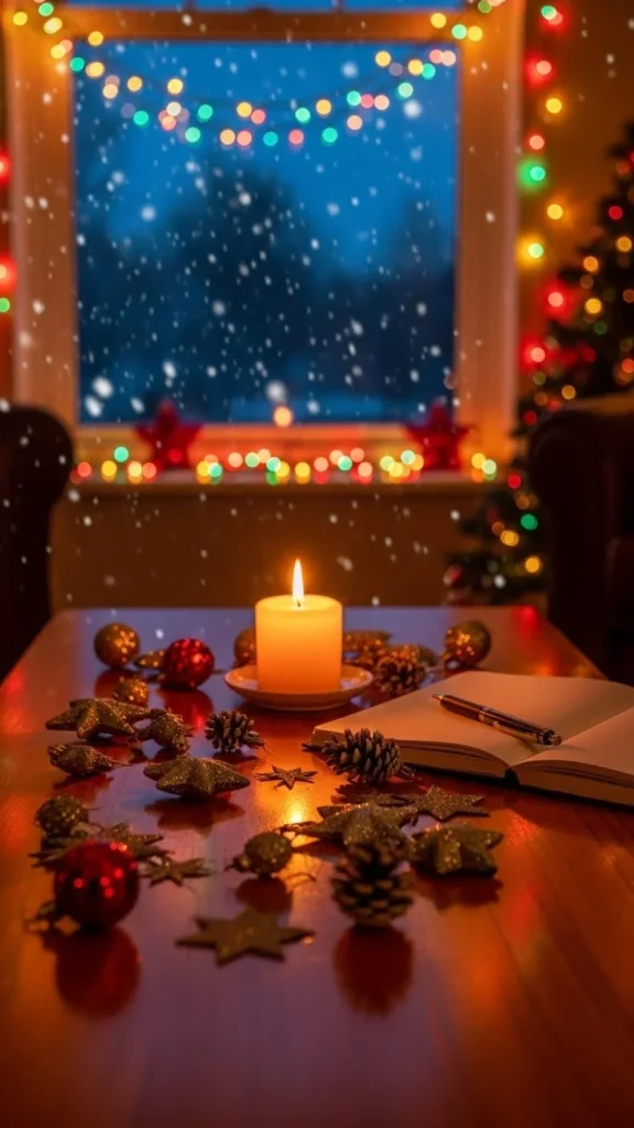 Starting your morning with light sets the emotional tone for the rest of the day. Place a small candle on your table and light it as soon as you wake up. Pause for a few moments. Let the warmth slow your thoughts. Then acknowledge three simple things you appreciate about the current season. Keep them small—warm socks, a message from someone kind, or the comfort of your home. These micro-thoughts shift your mood quickly and help you feel more aligned with what you want as the day unfolds. If you enjoy writing, jot them down in a tiny notebook or scrap paper you can tuck into your ornament box for next year.