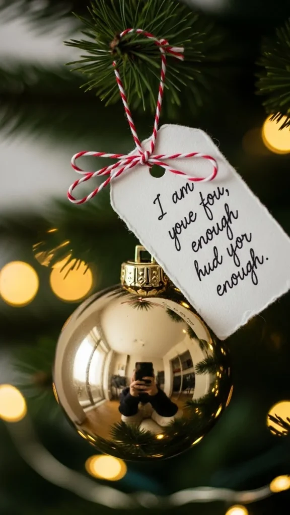 Turn a small ornament into a personal reminder. Write a short affirmation on a paper tag and tie it to your ornament with ribbon you already have. Use phrases like “I welcome calm moments” or “Good things are forming for me.” Hang it at eye level. Whenever you pass your tree, pause and breathe deeply. This adds meaning to your décor without spending money. Over time, the ornament becomes a steady reminder that your thoughts matter and your emotional tone shapes your day.