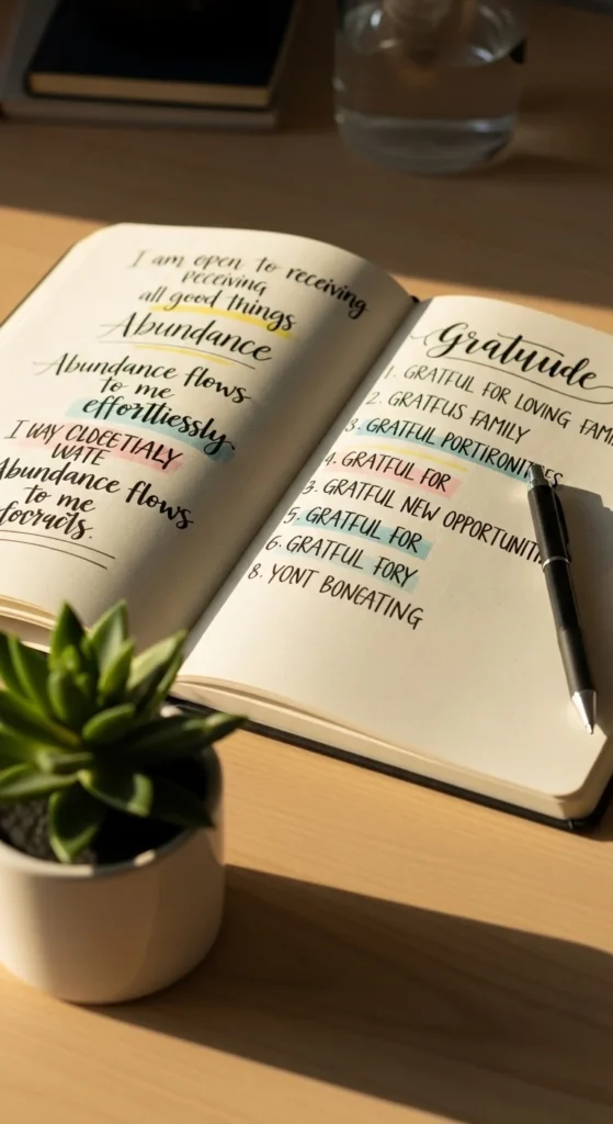 Use simple language like “I am thankful for steady income” and “I live with financial stability.”