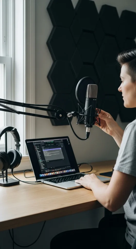 - Quiet space: Record in a small, soft-furnished room to reduce echo.