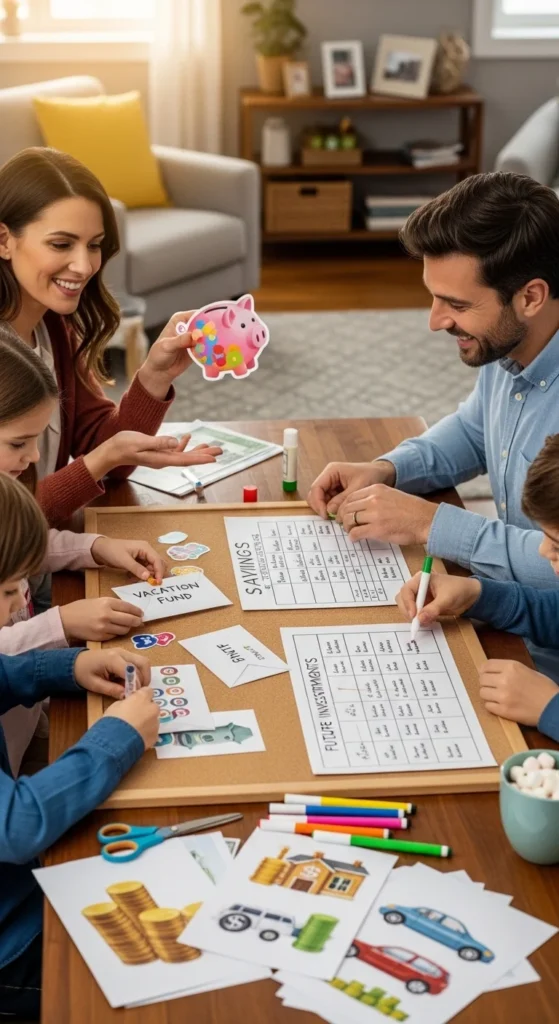 Financial visuals teach teamwork. Add goals like saving for trips, toys, or home upgrades. Use piggy bank drawings or envelopes.