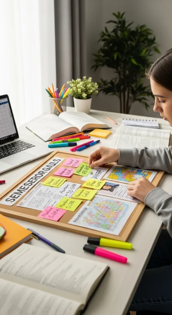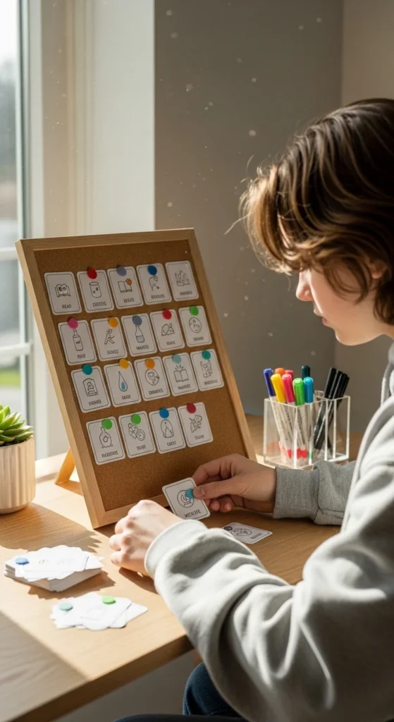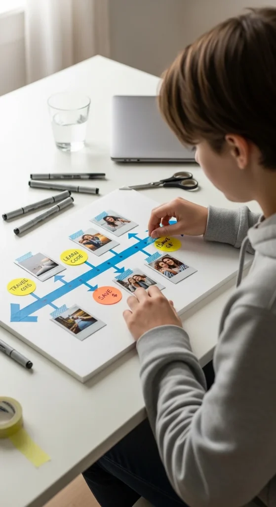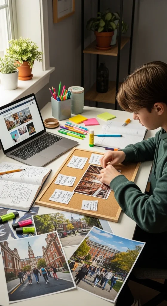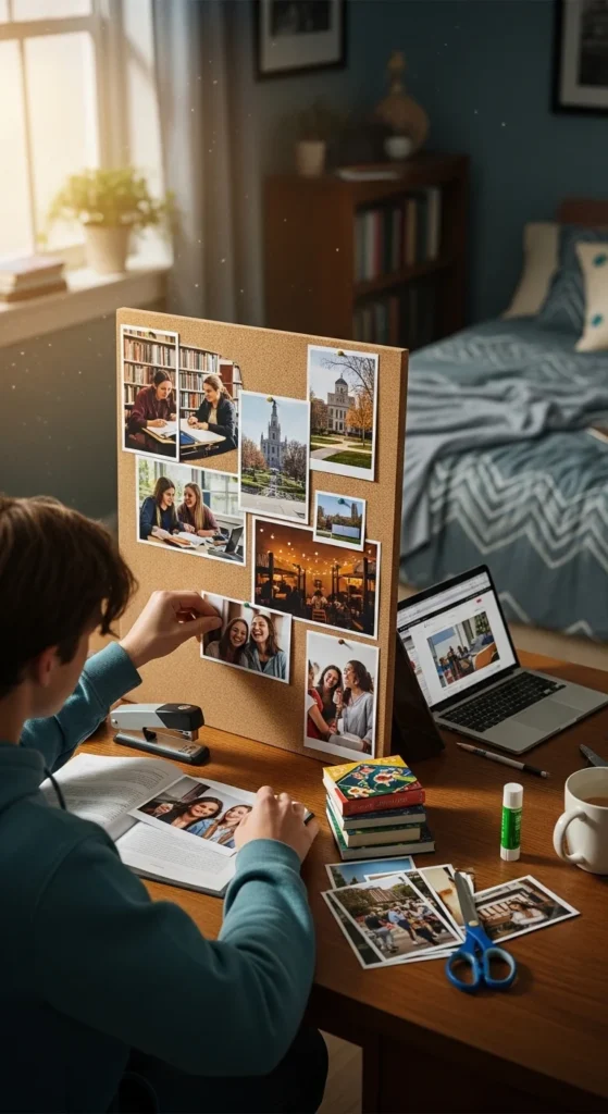 Academic boards help teens visualize school progress. Include subject icons, grade targets, and study routines. Teens can print images of classrooms, planners, or dream campuses.