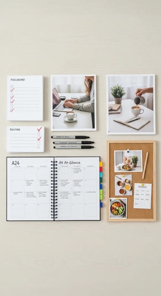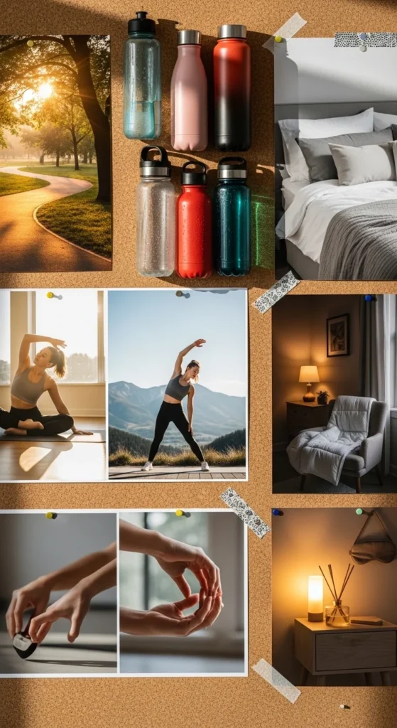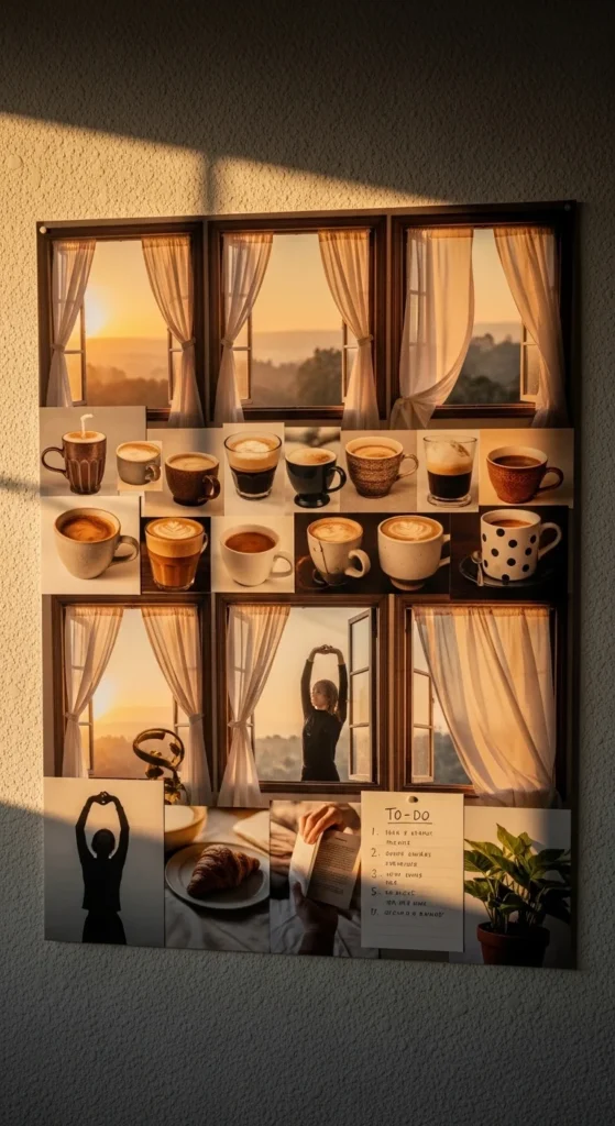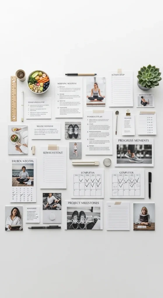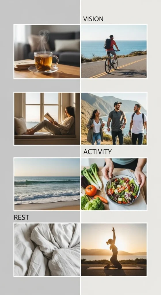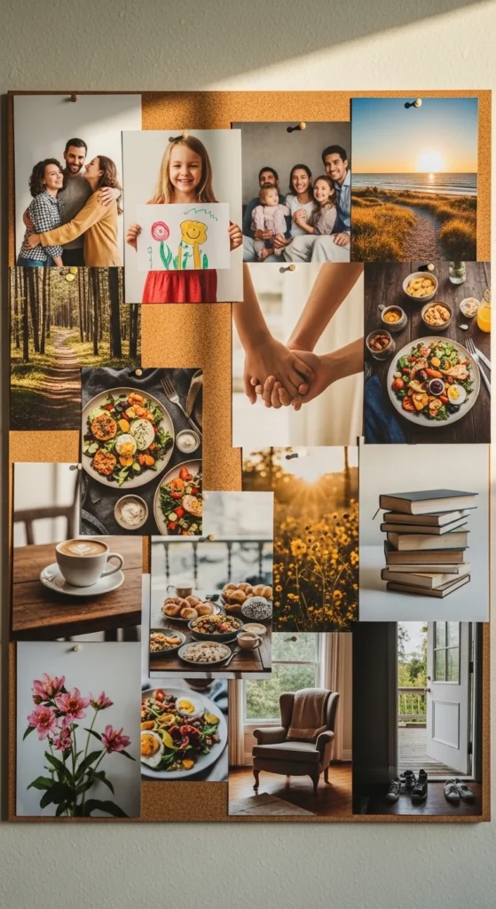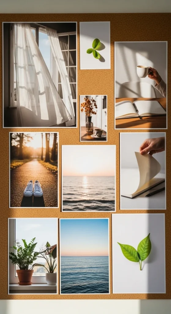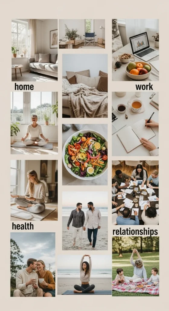 Choose one image for each area you care about. Home comfort. Work focus. Personal time. Movement. Keep the number small.